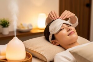 ヘッドスパ(首・側頭部中心)+ホットアイマスク+低めの枕が鉄板です。長時間のパソコン作業で凝り固まった部位を重点的にケアし、就寝時の姿勢も整えることで、翌朝のスッキリ感が大きく変わります。
